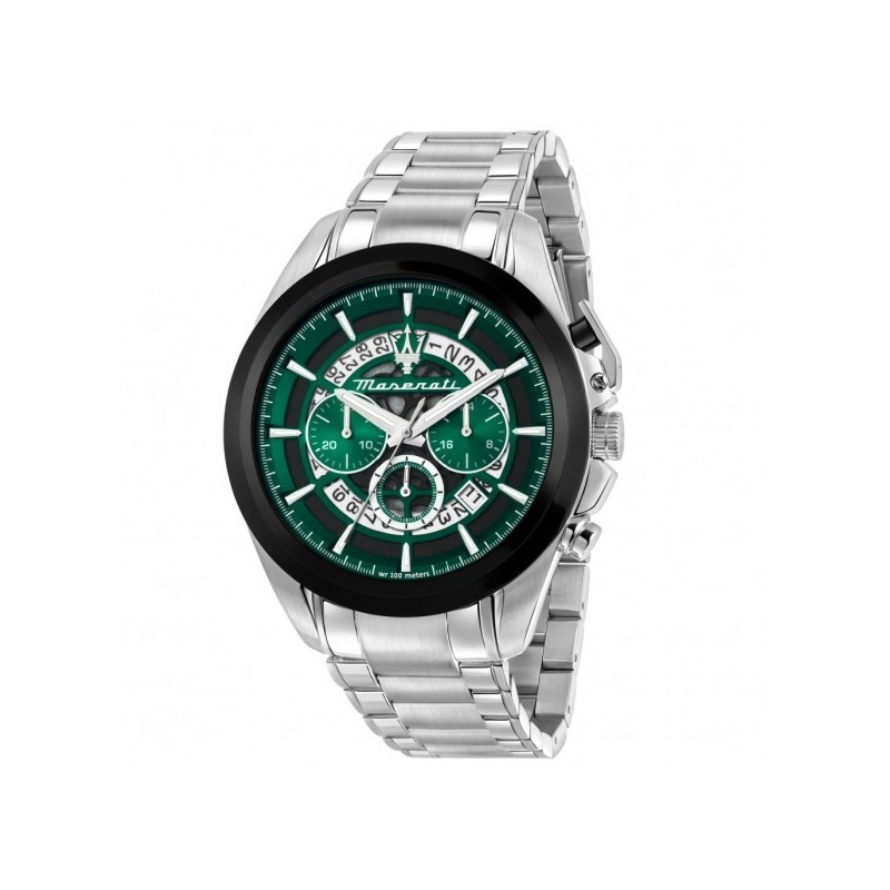 Orologio da polso uomo Maserati della collezione Traguardo con movimento al quarzo Miyota JS25 e funzione di cronografo con data. Cassa in acciaio inossidabile color argento di forma rotonda del diametro di 45 mm e spessore di 12,40 mm. Lunetta nera. Corona e fondello a vite per garantire impermeabilità.