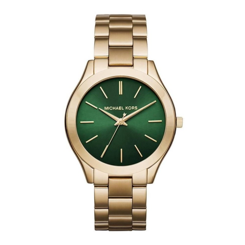 Orologio da polso donna Michael Kors della collezione Runway con movimento al quarzo e funzione di solo tempo. Cassa in acciaio inossidabile color oro di forma rotonda del diametro di 42 mm e spessore di 7 mm, fondello in acciaio a pressione. Quadrante analogico verde con indici a bastone color oro, logo sulla parte alta, vetro minerale. Cinturino in acciaio inossidabile color oro con chiusura deployante con pulsanti, resistente all'acqua 5 ATM: resistente agli spruzzi d'acqua ma non sotto pressione.