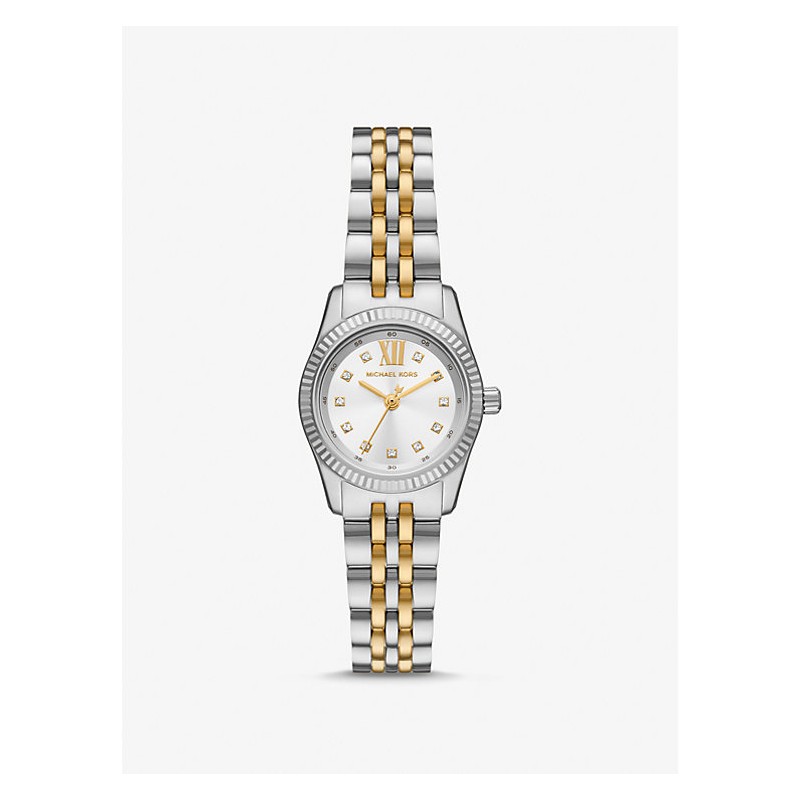 Orologio da polso donna Michel Kors della collezione Lexington con movimento al quarzo e funzione di solo tempo. cassa in acciaio inossidabile di forma rotonda color argento del diametro di 26 mm e spessore di 8 mm, lunetta in acciaio inossidabile color argento zigrinata., fondello in acciaio a pressione. Quadrante analogico argento con indici in pietre e numero romano solo sulla posizione 12, dettagli color oro. Cinturino in acciaio inossidabile bicolore argento e oro con chiusura deployante con pulsanti, resistente all'acqua 5 ATM: resistente agli spruzzi d'acqua ma non sotto pressione.