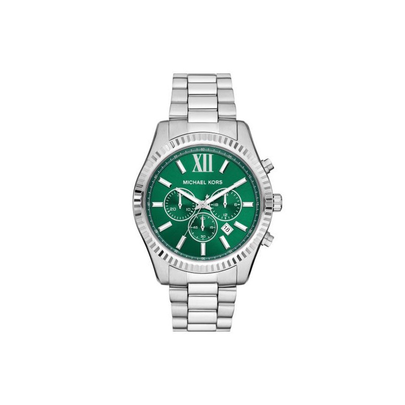 Orologio da polso uomo Michael Kors della collezione Lexington con movimento al quarzo e funzione di cronografo con data. Cassa in acciaio inossidabile di forma rotonda color argento del diametro di 44mm, fondello in acciaio a pressione, lunetta in acciaio zigrinata color argento. Quadrante analogico verde con indici a bastone e numero romano solo sulla posizione 12, datario tra le ore 4 e 5, logo sulla parte alta, vetro minerale. Cinturino in acciaio inossidabile color argento con chiusura deployante con pulsanti, resistente all'acqua 10 ATM.