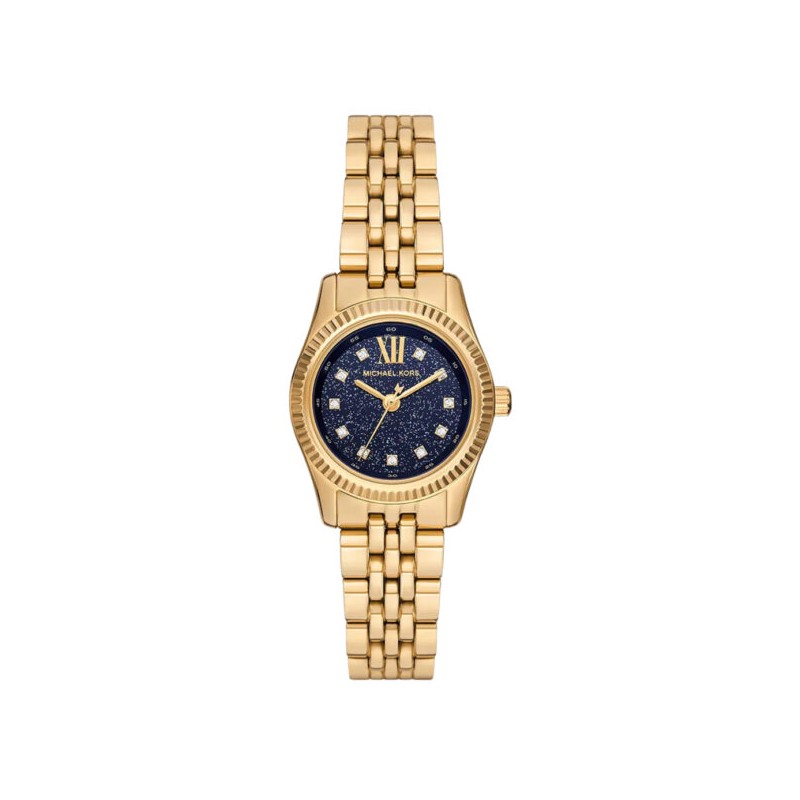 Orologio da polso donna Michael Kors della collezione Lexington con movimento al quarzo e funzione di solo tempo. Cassa in acciaio inossidabile di forma rotonda color oro del diametro di 26 mm, lunetta in acciaio zigrinata color oro, fondello in acciaio a pressione. Quadrante analogico blu con indici in pietre e numero romano solo sulla posizione 12, logo sulla parte alta, vetro minerale. Cinturino in acciaio inossidabile color oro con chiusura deployante con pulsanti, resistente all'acqua 5 ATM: resistente agli spruzzi d'acqua ma non sotto pressione.