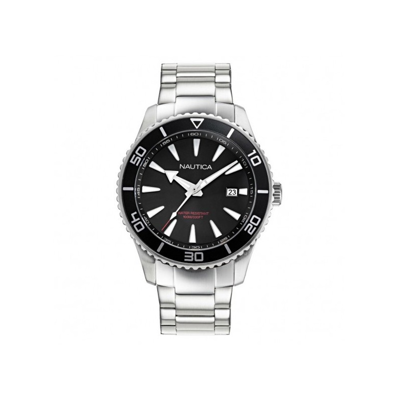 Orologio da polso uomo Nautica della collezione Pacific Beach con movimento al quarzo con funzioni di solo tempo con data. Cassa in acciaio inossidabile di forma rotonda color argento del diametro di 44 mm, ghiera in acciaio smaltata nera con minutiera, fondello e corona a vite per garantire una maggiore impermeabilità. Quadrante analogico nero con datario a ore 3, indici a bastoni e tre lancette luminose, vetro minerale. Cinturino in acciaio inossidabile color argento con chiusura deployante con pulsanti, resistente all'acqua 10 ATM.