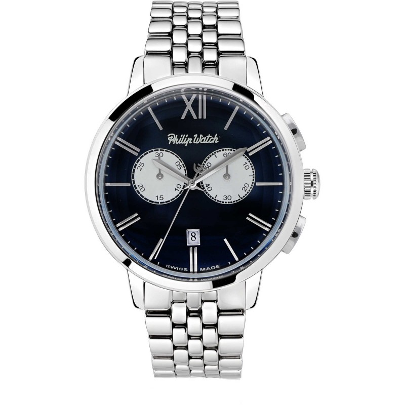 Orologio Cronografo Da Uomo Di Philip Watch Della Collezione Grand Archive 1940. Questo Modello È Realizzato In Acciaio E Ha Movimento Di Tipo Mvt. Ronda 5021 5H/Aig.1/Date 6H. Il Materiale È Acciaio E La Cassa Ha Colore Sunray Blu. Il Cinturino È Realizzato In Metallo Ed È Di Colore Acciaio. La Cassa Ha Dimensione 43 Mm