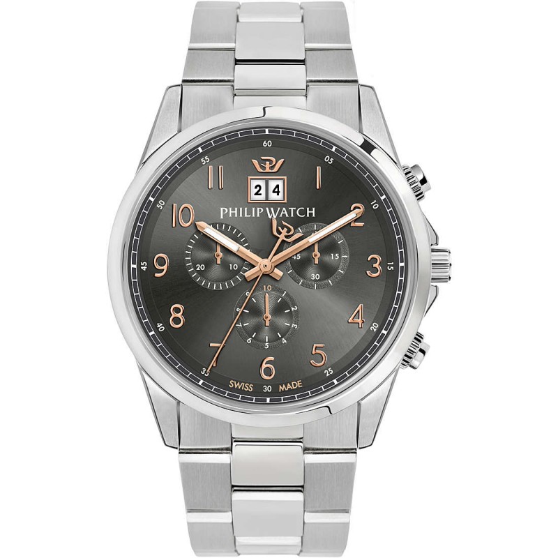 OROLOGIO PHILIP WATCH CAPETOWN - R8273612001 - Bluespirit experience: Fashion, Genere: Uomo, Materiale e finitura cassa: Acciaio, Misura cassa: 50,7x44mm, Spessore cassa: 11,7, Finitura cassa: Acciaio, Vetro: Zaffiro, quadrante rotondo grigio con indici in numeri arabi, materiale cinturino: Acciaio, Colore argento e Chiusura a Farfalla con pulsanti, Movimento: Quarzo con funzione cronografo e con certificazione swiss made resistente all'acqua 10 atm,