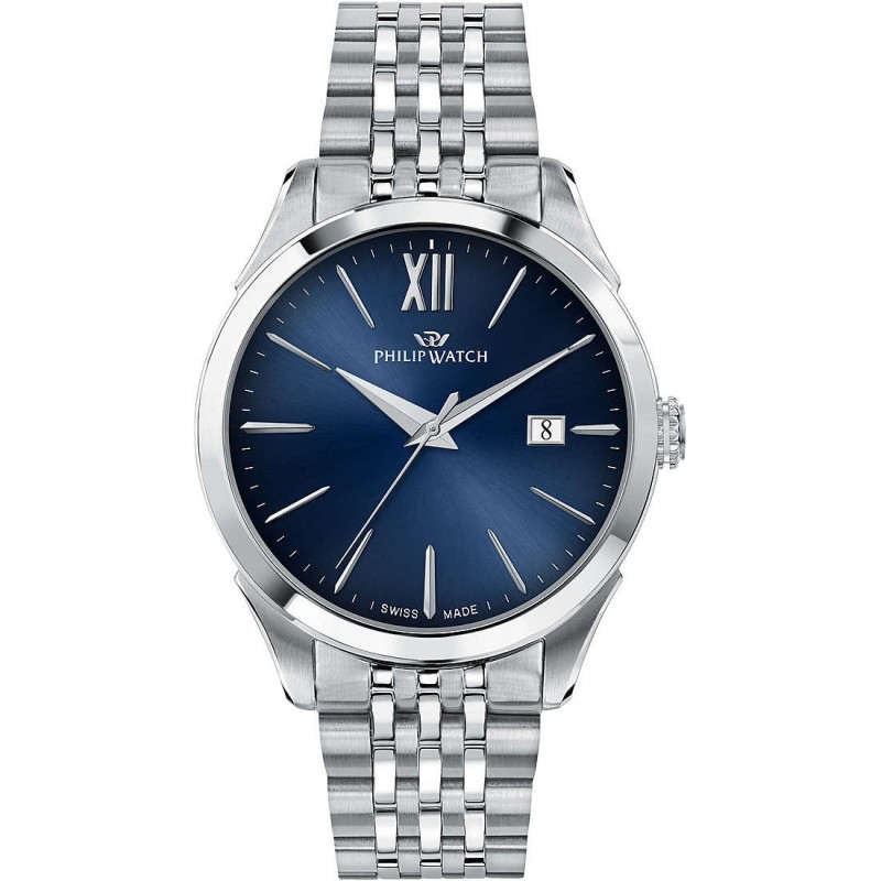 Orologio da Uomo Philip Watch R8253217002 Swiss Made della collezione Orologi Philip Watch Roma. Movimento solo tempo al quarzo swiss made Ronda 1015. Cassa in acciaio inox da 41 mm, sottile spessore di soli 7,50 mm. Vetro zaffiro antiriflesso. Quadrante blu con indici a bastone. Tre sfere con datario a ore tre. Corona a pressione. Fondello in acciaio serrato da viti. Bracciale in acciaio con chiusura deployante. Resistente all'acqua fino a 50 metri.