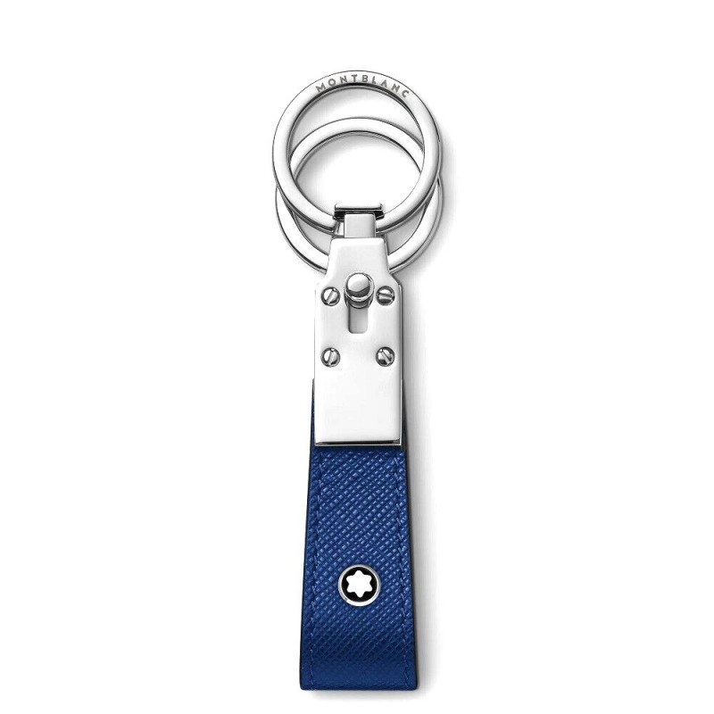 Portachiavi unisex della collezione sartoriale del marchio Mont Blanc realizzato in pelle bovina pieno fiore con stampa soffiano di colore blu, passante con due anelli di cui uno amovibile con logo e gancio in acciaio pregiato con finitura lucida. Le dimensioni sono di 30x 15x 110 cm