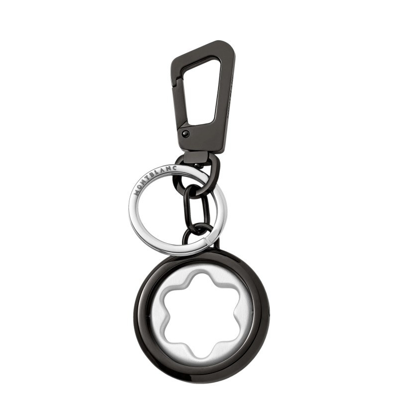 Portachiavi Mont Blanc  della collezione Meisterstuck da uomo con emblema Mont Blanc girevole realizzato in acciaio pregiato, corpo in ottone massiccio ed emblema in alluminio di colore nero. Si compone di un anello per più chiavi e un gancio per assicurarlo a qualsiasi accessorio. Le dimensioni corrispondono a 40 x 30 x 115 mm