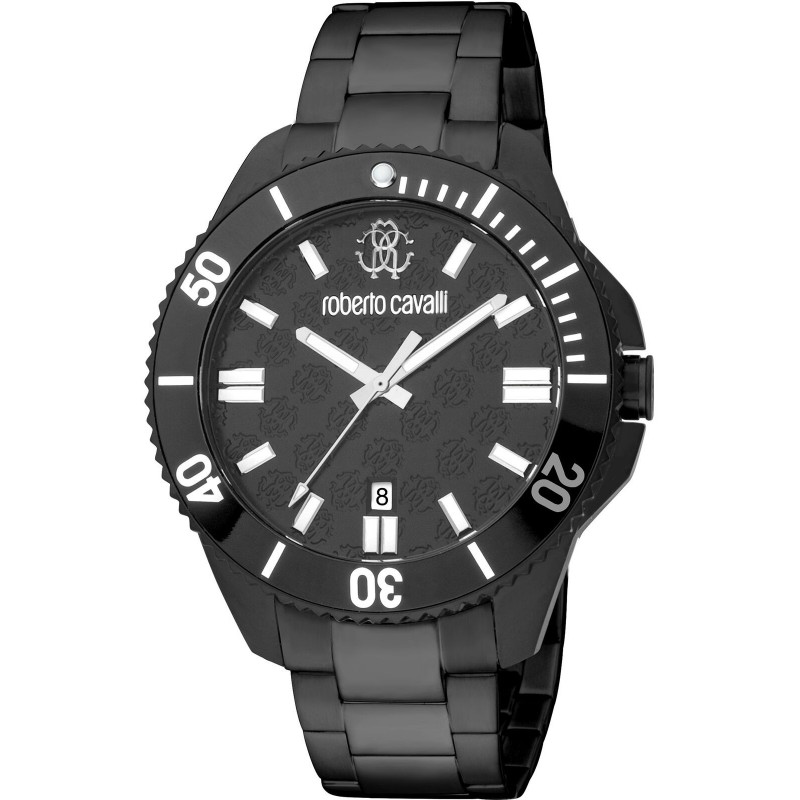 Orologio da polso uomo Roberto Cavalli con movimento al quarzo e funzione di solo tempo con data. Cassa in acciaio inossidabile di forma rotonda nera del diametro di 43 mm e spessore di 11 mm, ghiera in acciaio smaltata nera con minutiera. Quadrante analogico ner0 con motivo logo, indici a bastone, logo sulla parte alta, vetro minerale.Cinturino in acciaio inossidabile di colore nero con chiusura deployante con pulsanti resistente all'acqua 10 ATM.