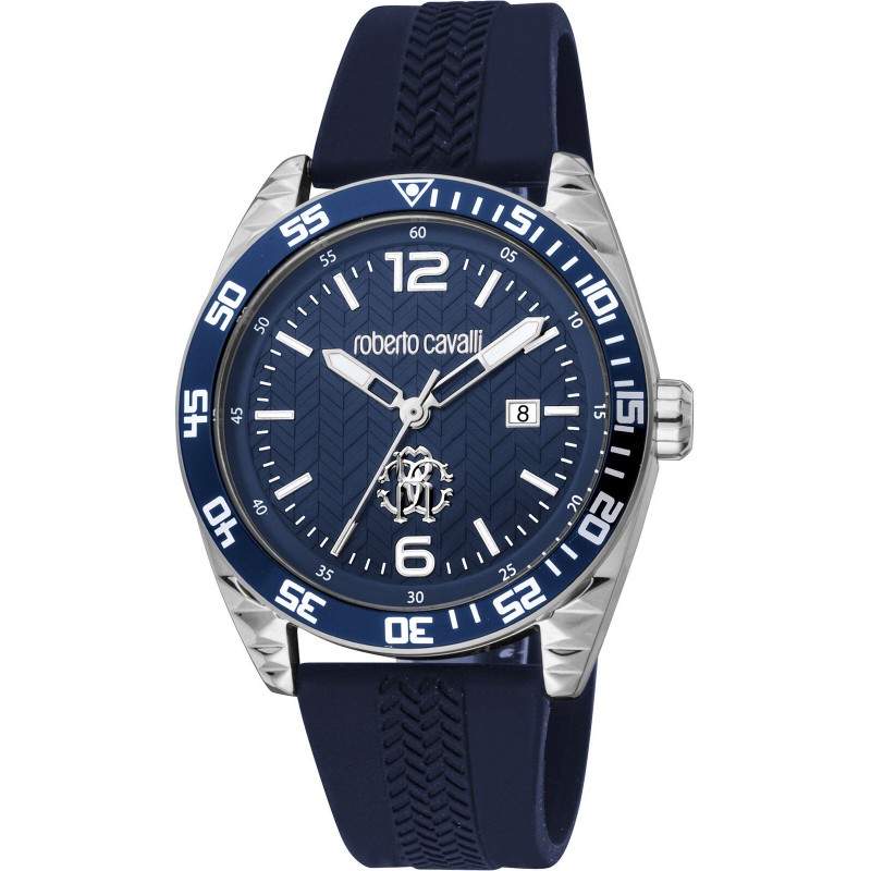 Orologio da polso uomo Roberto Cavalli con movimento al quarzo e funzione di solo tempo con data. Cassa in acciaio inossidabile di forma rotonda color argento del diametro di 42 mm e spessore di 12 mm, ghiera in acciaio smaltata blu con minutera. Quadrante analogico blu con indici a bastone e numeri arabi solo sulle posizioni 12 e 6, datario sulle ore 3, logo sulla parte alta, vetro minerale. Cinturino in silicone blu con chiusura fibbia ad ardiglione, resistente all'acqua 10 ATM.