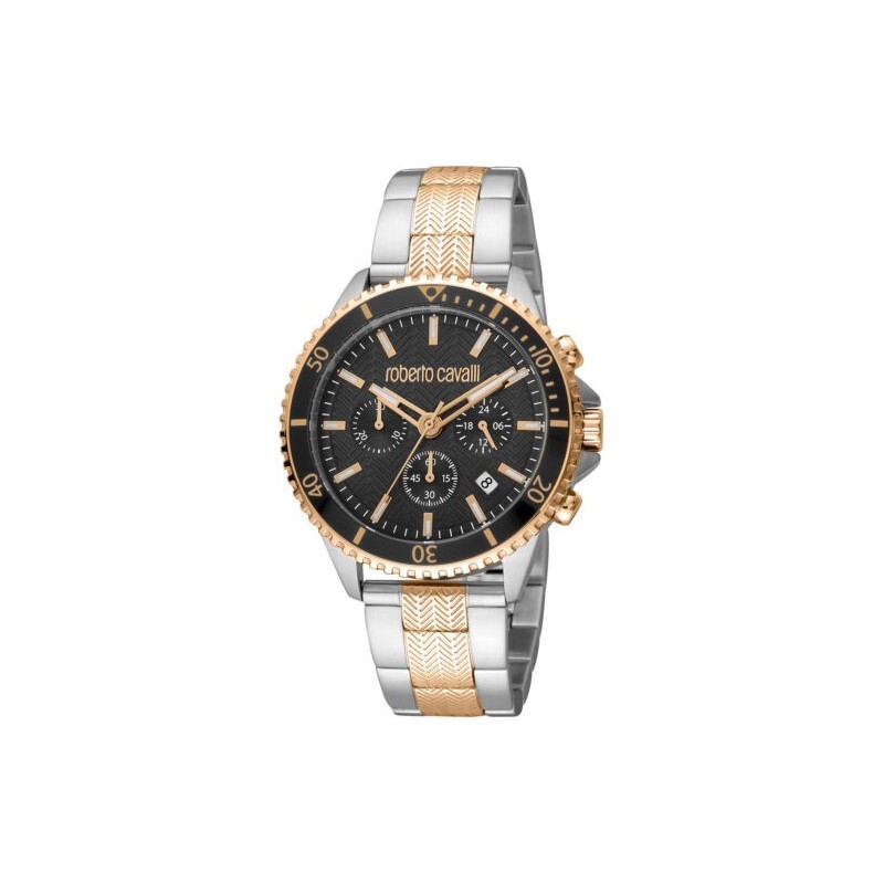 Orologio da polso uomo Roberto Cavalli con movimento al quarzo e funzione di cronografo con data. Cassa in acciaio inossidabile di forma rotonda color argento del diametro di 42 mm e spessore di 11 mm, ghiera in acciaio smaltata nera e color oro zigrinata con minutiera. Quadrante analogico nero con indici a bastoni e dettagli color oro, datario tra le ore 4 e 5, logo sulla parte alta, vetro minerale. Cinturino in acciaio inossidabile bicolore argento e oro con motivo e chiusura deployante con pulsanti, resistente all'acqua 10 ATM.