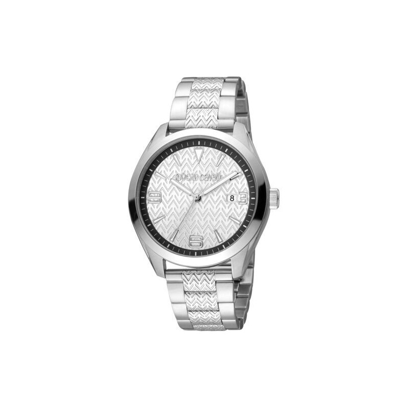 Orologio da polso uomo Roberto cavalli con movimento al quarzo e funzione di solo tempo con data. Cassa in acciaio inossidabile di forma rotonda color argento del diametro di 42 mm e spessore di 11 mm, ghiera in acciaio inossidabile color argento lucida fissa. Quadrante analogico argento con dettagli neri e indici misti a bastoni e numeri arabi, datario sulle ore 3, logo sulla parte alta, vetro minerale. Cinturino in acciaio inossidabile color argento con motivo e chiusura deployante con pulsanti, resistente all'acqua 10 ATM.