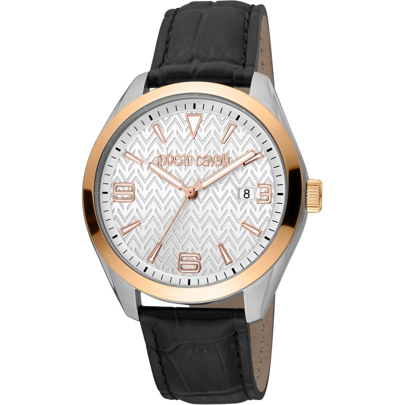 Orologio da polso uomo Roberto Cavalli con movimento al quarzo e funzione di solo tempo con data. Cassa in acciaio inossidabile di forma rotonda color argento del diametro di 42 mm e spessore di 11 mm, ghiera in acciaio color oro rosa lucida fissa. Quadrante analogico argento con indici misti a bastoni e numeri arabi color oro rosa, datario sulle ore 3, logo sulla parte alta, vetro minerale. Cinturino in pelle nero con chiusura fibbia ad ardiglione, resistente all'acqua 10 ATM.