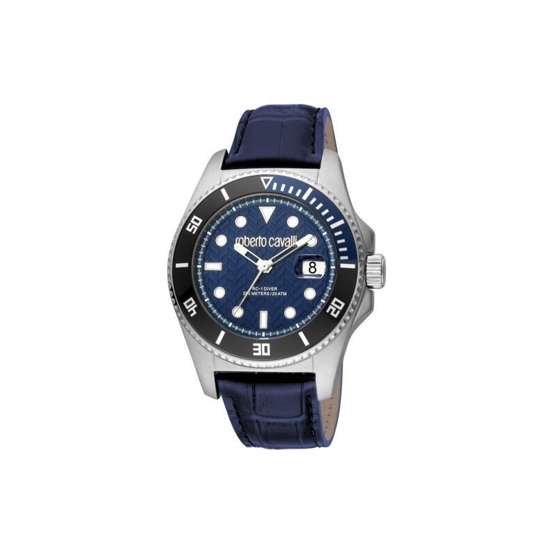 Orologio da polso uomo Roberto Cavalli con movimento al quarzo e funzione di solo tempo con data. cassa in acciaio inossidabile di forma rotonda color argento del diametro di 44 mm e spessore di 13 mm, ghiera in acciaio placcata nera e blu con minutiera. Quadrante analogico blu con indici geometrici, datario sulle ore 3, logo sulla parte alta, vetro minerale. Cinturino in pelle blu con chiusura fibbia ad ardiglione, resistente all'acqua 10 ATM.