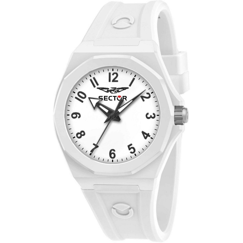Orologio Solo Tempo Da Uomo Di Sector Della Collezione 960. Orologio Con Cassa Rotonda In Policarbonato Del Diametro Di 41 Mm. Il Quadrante È Di Colore Bianco Opaco Con Vetro Minerale. Il Cinturino È Realizzato In Silicone Di Colore Bianco Con Chiusura Fibbia Ardiglione. Il Movimento È Al Quarzo. La Resistenza All'Acqua È Di 5 Atm