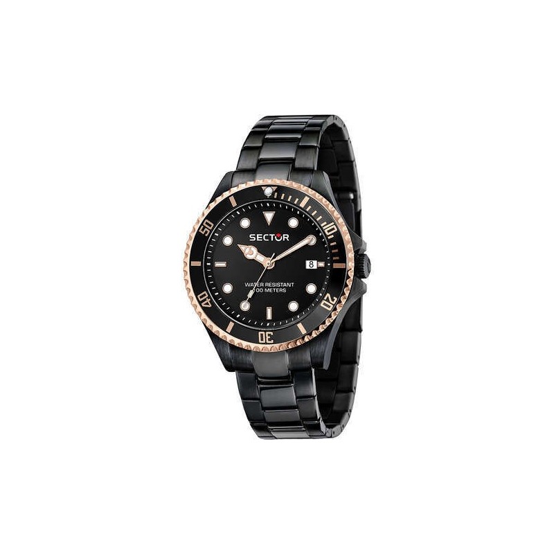 Orologio solo tempo da uomo di Sector della collezione 230. Modello con cassa tonda del diametro di 43mm e spessore di 11,70 mm in acciaio e pvd nero. Quadrante nero con indici a geometrici misti , funzione data, vetro minerale, ghiera zigrinata color oro rosa e nero. Orologio con bracciale in metallo di colore nero con chiusura con fermo di sicurezza. Modello con movimento al quarzo, datario e resistenza all'acqua di 10 ATM