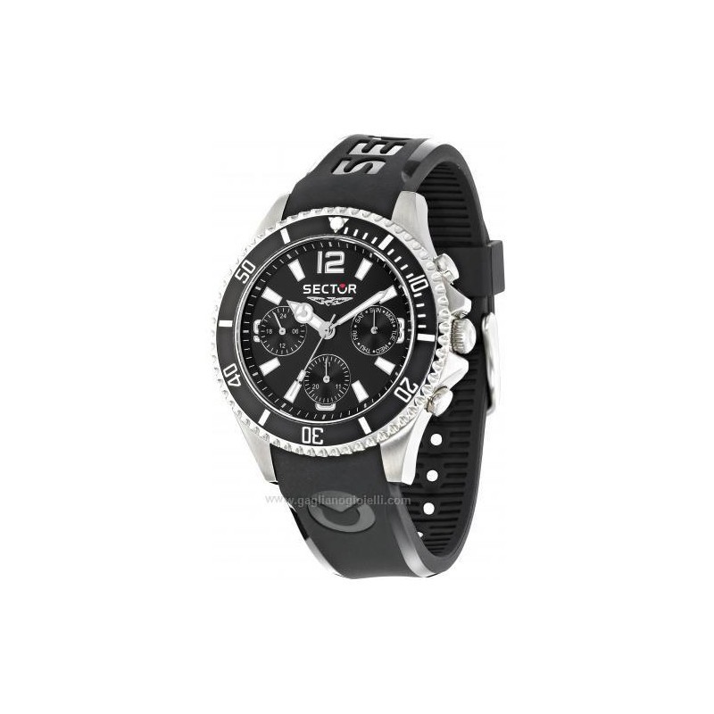 Orologio multifunzione da uomo della collezione Sector 230. Cassa in acciaio color argento da 43 mm di diametro, con ghiera di colore nero, quadrante analogico nero con indici a bastone bianchi,funzione data e cronografo, vetro minerale. Cinturino in gomma nero con chiusura fibbia ad ardiglione. Movimento al quarzo resistente all'acqua 10 ATM