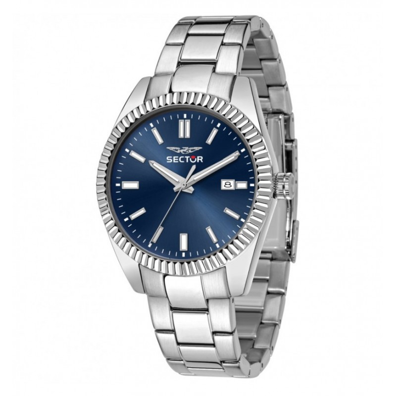 Orologio da polso uomo Sector della collezione 240 con movimento al quarzo Miyota 2315 e funzioni di solo tempo con data. cassa in acciaio inossidabile color argento di forma rotonda del diametro di 41 mm e spessore di 10,70 mm, lunetta in acciaio zigrinata. Quadrante analogico blu con indici a bastoni e datario a ore 3, logo sulla parte alta, vetro minerale. Cinturino in acciaio inossidabile color argento con chiusura fibbia diver con pulsanti e blocco di sicurezza, resistente all'acqua 5 ATM: resistente agli spruzzi d'acqua ma nono sotto pressione.