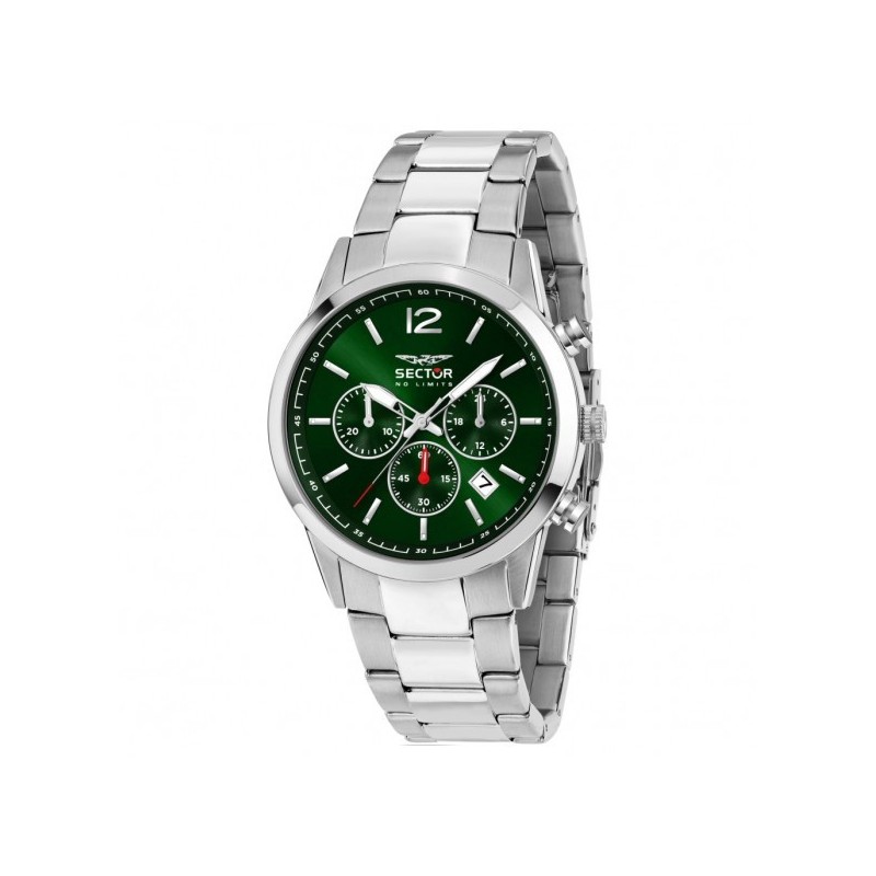 Orologio da polso uomo Sector della collezione 660 con movimento al quarzo e funzione cronografo con data. Cassa in acciaio inossidabile di forma rotonda color argento del diametro di 41 mm e spessore di 10,20 mm. Quadrante analogico verde con indici a bastoni, logo nella parte alta e datario tra le ore 4 e 5, vetro minerale. Cinturino in acciaio inossidabile color argento con chiusura deployante con pulsanti e blocco di sicurezza, resistente all'acqua 5 ATM: resistente agli spruzzi d'acqua ma non sotto pressione.