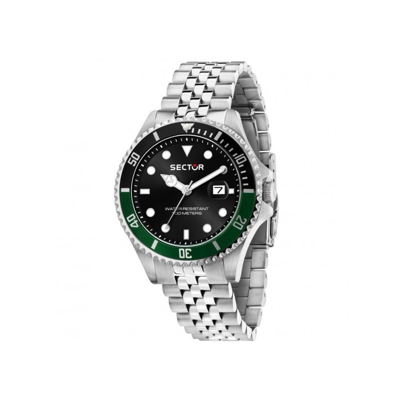 Orologio da polso uomo Sector della collezione 230 con movimento al quarzo Miyota 2115 e funzioni di solo tempo con data. Cassa in acciaio inossidabile di forma rotonda color argento del diametro di 43 mm e spessore di 11,70 mm. Lunetta in alluminio con trattamento ip nero e verde.