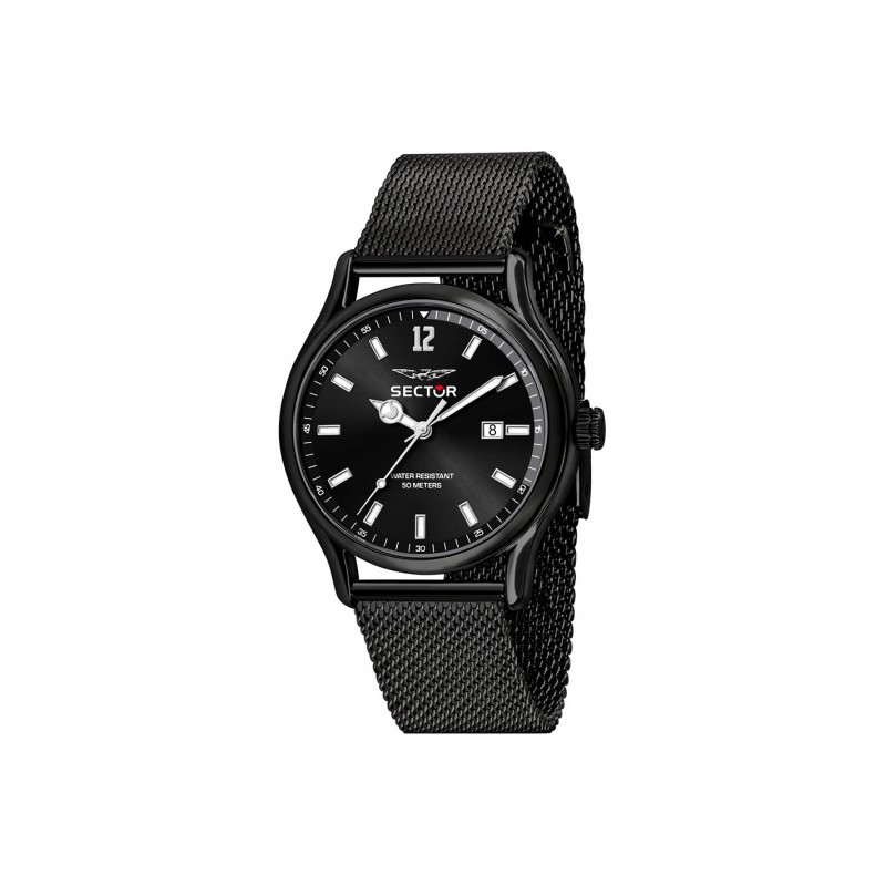 Orologio da polso uomo Sector della collezione 660 con movimento al quarzo e funzione di solo tempo con data. Cassa in acciaio inossidabile di forma rotonda nera del diametro di 43 mm e spessore di 10,80 mm, fondello in acciaio a vite. Quadrante analogico nero con indici a bastoni e numero arabo solo sulla posizione 12, datario sulle ore 3, logo sulla parte alta, vetro minerale. Cinturino in acciaio inossidabile nero in maglia milano con chiusura regolabile a clip, resistente all'acqua 5 ATM:resistente agli spruzzi d'acqua ma non sotto pressione.
