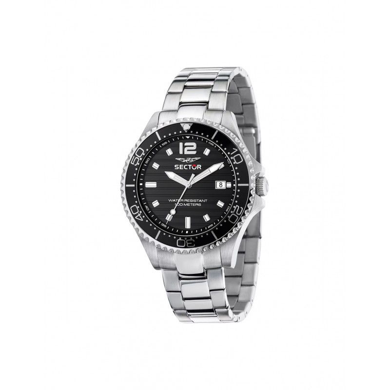 Orologio da polso uomo Sector Limited Edition della collezione 230 con movimento al quarzo e funzione di solo tempo con data. Cassa in acciaio inossidabile di forma rotonda color argento del diametro di 43 mm e spessore di 11,7 mm, fondello in acciaio a vite, lunetta in acciaio nera con minutiera. Quadrante analogico nero con indici a bastoni e numero arabo solo sulla posizione 12, datario sulle ore 3, logo sulla parte alta, vetro minerale. Cinturino in acciaio inossidabile color argento con chiusura deployante e fermo di sicurezza, resistente all'acqua 10 ATM.