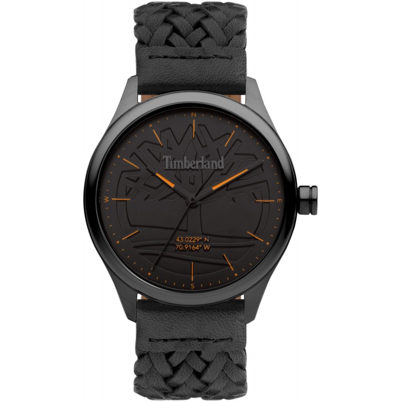 Orologio da polso uomo Timberland con movimento al quarzo e funzione di solo tempo. Cassa in acciaio inossidabile con trattamento IP nera di forma rotonda del diametro di 40 mm e spessore di 8,5 mm, fondello in acciaio a pressione, corona a estrazione, quadrante analogico nero con indici a bastone di color arancio, logo sulla parte alta, vetro minerale. Cinturino in pelle nero intrecciato a spiga con chiusura fibbia ad ardiglione, resistente all'acqua 5 ATM: resistente agli spruzzi d'acqua ma non sotto pressione.