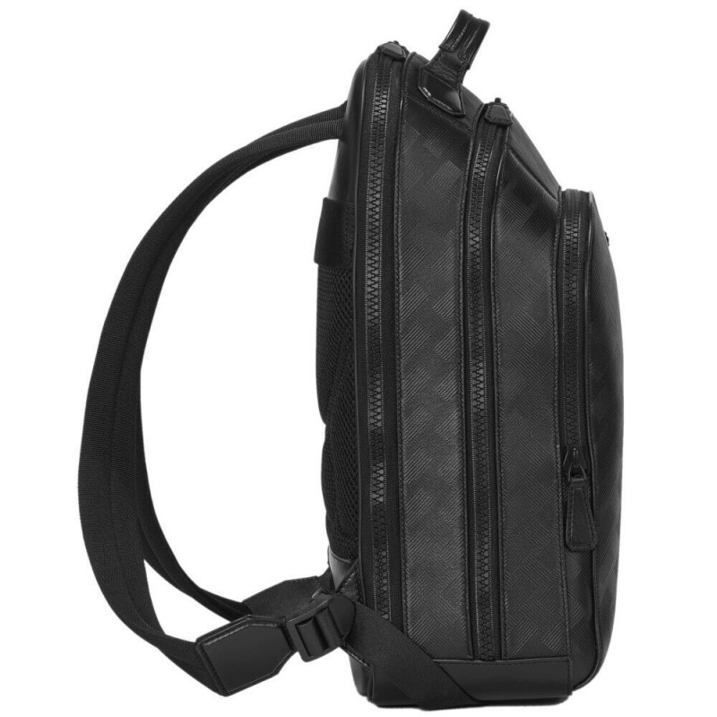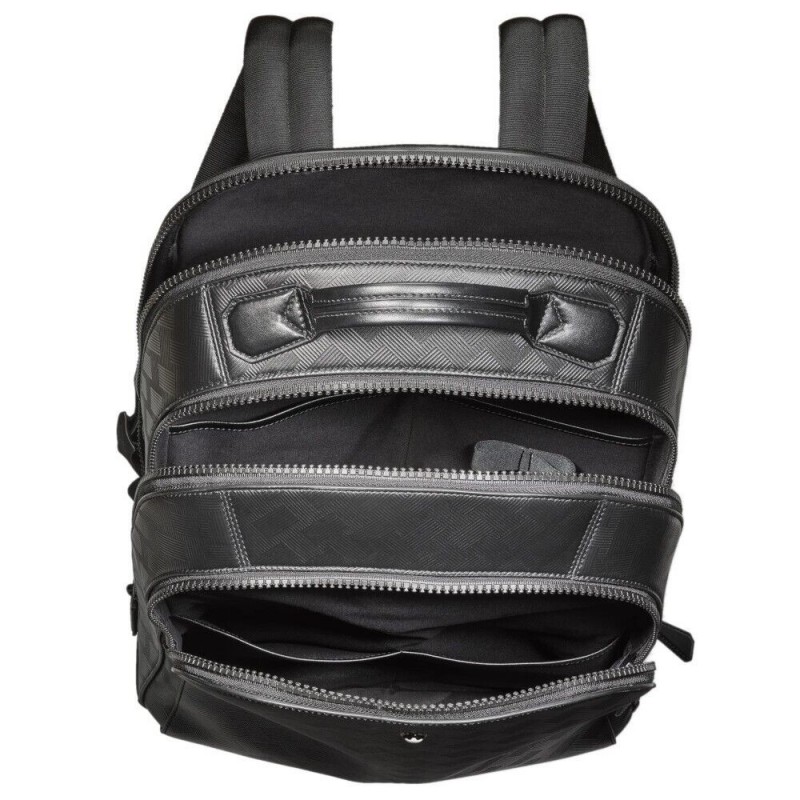 Zaino Mont Blanc unisex della collezione Extreme 3.0 realizzato in pelle di bovino nera pieno fiore groffata con motivo Montblanc Extreame 3.0. Lo zaino è composto da 3 scomparti con uno imbottito per computer portatili fino a 13" dispone anche di varie tasche e 2 passanti per strumenti da scrittura. La fodera è composta da tessuto riciclato le chiusure sono con cerniera. Il tutto completato da 2 cinghie regolabili. Le dimensioni corrispondono 275 x 140 x 400 mm.